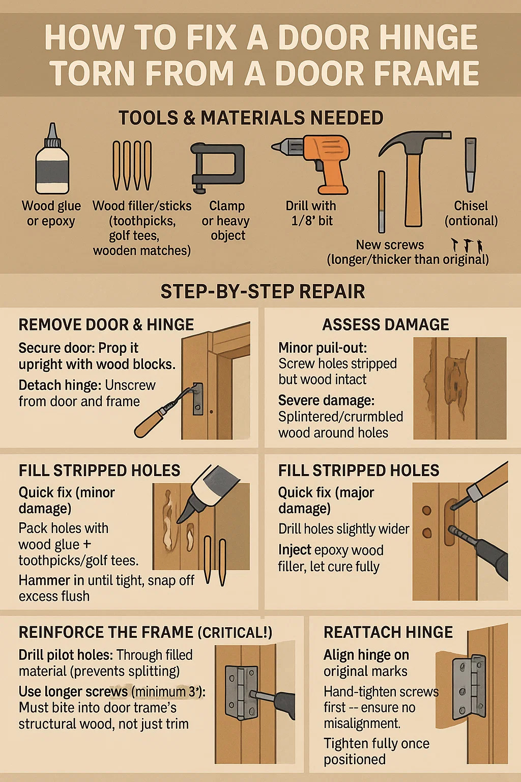 এখানে কীভাবে ঠিক করবেন দরজা কব্জা একটি দরজার ফ্রেম থেকে ছেঁড়া, ধাপে ধাপে: