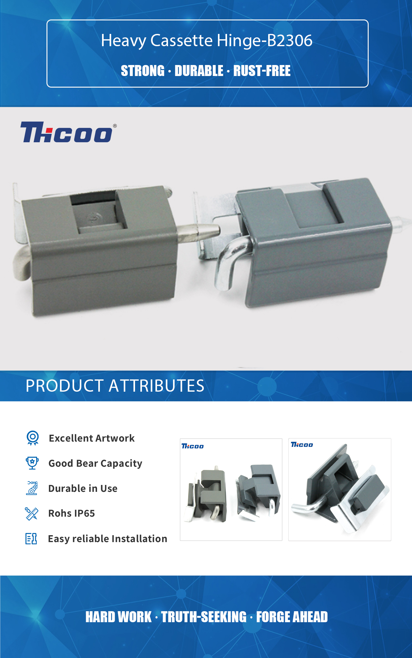 আমাদের নিজস্ব টেস্টিং ল্যাব এবং উন্নত এবং সম্পূর্ণ পরিদর্শন সরঞ্জাম রয়েছে, যা পণ্যের গুণমান নিশ্চিত করতে পারে। হেভি ক্যাসেট Hinge-B2306  কে একটি ভারী প্যানেল বা দরজা সমর্থন করার জন্য ডিজাইন করা হয়েছে। এই কব্জাগুলি প্রায়শই বিভিন্ন ফিনিশের মধ্যে পাওয়া যায়, যেমন ক্রোম বা কালো, যা তাদের আশেপাশের সাজসজ্জার সাথে মিশে যেতে দেয়৷
